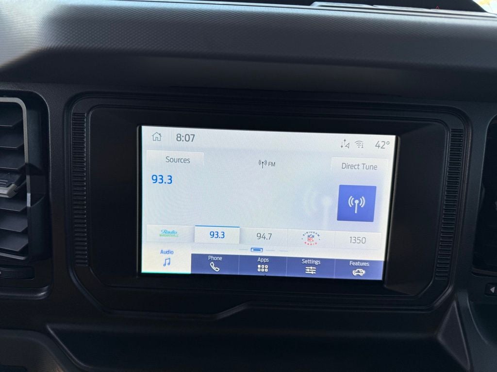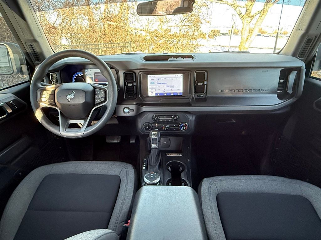 2022 Ford Bronco 4WD 2.3L EcoBoost I-4 10-Speed Automatic 3.73 Axle Ratio, 4-Wheel Disc Brakes, 6 Speakers, ABS brakes, Air Conditioning, AM/FM radio: SiriusXM with 360L, AM/FM Stereo, Auto High-beam Headlights, Brake assist, Cloth Bucket Seats, Compass, Delay-off headlights, Driver door bin, Driver vanity mirror, Dual front impact airbags, Dual front side impact airbags, Electronic Stability Control, Emergency communication system: 911 Assist, Equipment Group 101A Standard Package, Exterior Parking Camera Rear, Front anti-roll bar, Front Bucket Seats, Front Center Armrest, Front reading lights, Front wheel independent suspension, Fully automatic headlights, Heated door mirrors, Illuminated entry, Integrated roll-over protection, Low tire pressure warning, Occupant sensing airbag, Outside temperature display, Overhead airbag, Overhead console, Panic alarm, Passenger door bin, Passenger vanity mirror, Power door mirrors, Power steering, Power windows, Radio data system, Remote keyless entry, Security system, SiriusXM Radio w/360L, Speed control, Split folding rear seat, Steering wheel mounted audio controls, SYNC 4, Tachometer, Telescoping steering wheel, Tilt steering wheel, Traction control, Trip computer, Variably intermittent wipers, Wheels: 16 Bright Polished Silver-Painted Steel. CARFAX One-Owner.