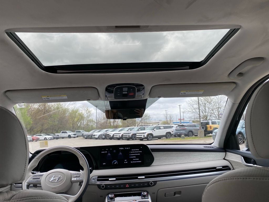 2025 Hyundai Palisade AWD V6 8-Speed Automatic with SHIFTRONIC 12 Speakers, 3rd row seats: split-bench, 4-Wheel Disc Brakes, ABS brakes, Air Conditioning, Alloy wheels, AM/FM radio: SiriusXM, Apple CarPlay & Android Auto, Auto High-beam Headlights, Auto-dimming door mirrors, Auto-dimming Rear-View mirror, Auto-leveling suspension, Automatic temperature control, Brake assist, Bumpers: body-color, Cargo Net, Cargo Tray, Carpeted Floor Mats, Compass, Cross Rails, Delay-off headlights, Driver door bin, Driver vanity mirror, Dual front impact airbags, Dual front side impact airbags, Electronic Stability Control, Emergency communication system, Exterior Parking Camera Rear, First Aid Kit, Four wheel independent suspension, Front anti-roll bar, Front Bucket Seats, Front Center Armrest, Front dual zone A/C, Front reading lights, Fully automatic headlights, Garage door transmitter: HomeLink, harman/kardon® Speakers, Heads-Up Display, Heated & Ventilated Front Bucket Seats, Heated door mirrors, Heated front seats, Heated rear seats, Heated steering wheel, Illuminated entry, Knee airbag, Leather steering wheel, Low tire pressure warning, Memory seat, Navigation System, Occupant sensing airbag, Option Group 01, Outside temperature display, Overhead airbag, Overhead console, Panic alarm, Passenger vanity mirror, Power door mirrors, Power driver seat, Power Liftgate, Power moonroof, Power passenger seat, Power steering, Power windows, Premium Nappa Leather Seat Trim, Radio data system, Radio: AM/FM/MP3 Premium Audio System, Rain sensing wipers, Rear air conditioning, Rear anti-roll bar, Rear audio controls, Rear Bumper Applique, Rear reading lights, Rear side impact airbag, Rear window defroster, Rear window wiper, Reclining 3rd row seat, Remote keyless entry, Security system, Speed control, Speed-sensing steering, Split folding rear seat, Spoiler, Steering wheel mounted audio controls, Tachometer, Telescoping steering wheel, Tilt steering wheel, Traction control, Trip computer, Turn signal indicator mirrors, Variably intermittent wipers, Ventilated front seats, Ventilated rear seats, Wheel Locks, Wheels: 20 x 7.5J Calligraphy Exclusive Alloy. CARFAX One-Owner.