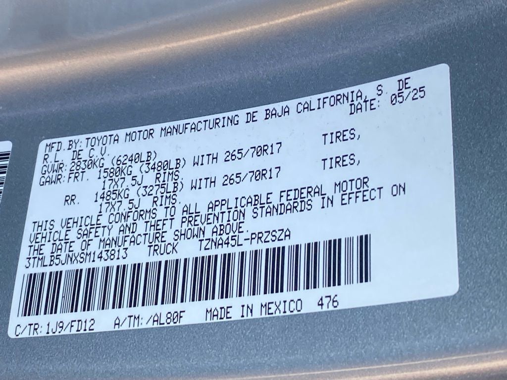 4WD, 3.583 Axle Ratio, 4-Wheel Disc Brakes, 6 Speakers, ABS brakes, Air Conditioning, Alloy wheels, AM/FM radio: SiriusXM, Anti-whiplash front head restraints, Apple CarPlay/Android Auto, Auto High-beam Headlights, Auto-dimming Rear-View mirror, Automatic temperature control, Brake assist, Bumpers: body-color, Driver door bin, Driver vanity mirror, Dual front impact airbags, Dual front side impact airbags, Electronic Stability Control, Emergency communication system: Safety Connect (1-year trial), Exterior Parking Camera Rear, Fabric Seat Trim, Four wheel independent suspension, Front anti-roll bar, Front Bucket Seats, Front Center Armrest, Front fog lights, Front reading lights, Fully automatic headlights, Heated door mirrors, Illuminated entry, Knee airbag, Leather Shift Knob, Leather steering wheel, Low tire pressure warning, Occupant sensing airbag, Outside temperature display, Overhead airbag, Overhead console, Panic alarm, Passenger door bin, Passenger vanity mirror, Power door mirrors, Power steering, Power windows, Radio: 8 Toyota Audio Multimedia, Rear step bumper, Rear window defroster, Remote keyless entry, Security system, Speed control, Speed-sensing steering, Split folding rear seat, Steering wheel mounted audio controls, Tachometer, Telescoping steering wheel, Tilt steering wheel, Traction control, Trip computer, Turn signal indicator mirrors, Variably intermittent wipers, Wheels: 17 TRD Off-Road Alloy, 4WD.
